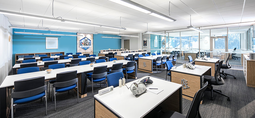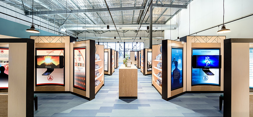 Tous ceux approchant la nouvelle Église de Scientology de Perth sont accueillis par sa façade impressionnante. En tant que paroissiens ils entrent dans le grand espace et sont accueillis à la réception avec vue sur le centre d’information public. L’espace est ouvert avec de hauts plafonds et les éclairages de type industriel. Des lignes propres, le métal sombre et le bois chaud et rustique donnent un côté industriel moderne que vous pouvez sentir dans tout l’espace.