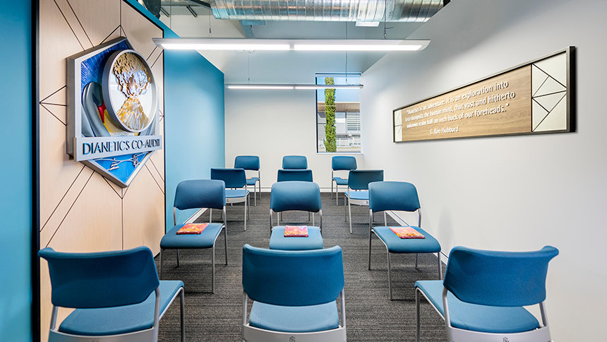 De plus, l’Église possède de nombreuses pièces aménagées spécialement afin d’offrir des conditions idéales pour l’audition (conseil spirituel) de Scientology. Plusieurs salles de cours sont également dédiées à la formation des auditeurs (conseillers spirituels) pour les scientologues qui étudient les techniques d’audition afin d’aider les autres à atteindre la liberté spirituelle.