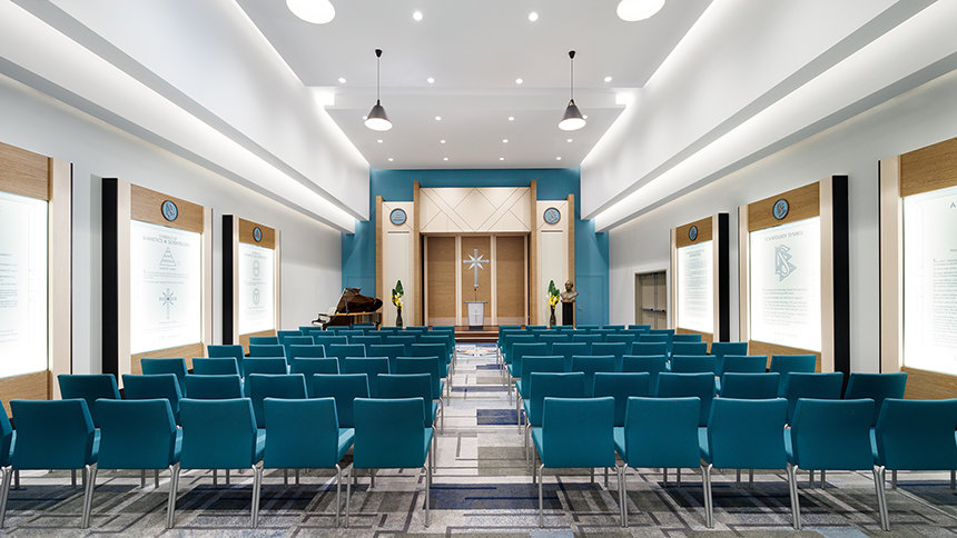 La chapelle de Perth est vaste avec des corniches lumineuses, créant une illusion d’un plafond flottant au-dessus. Elle accueille les rassemblements de la congrégation des scientologues, dont les services dominicaux, les cérémonies de mariage de de baptêmes, ainsi que des évènements de toute la communauté tels que des banquets, des séminaires et des ateliers ouverts aux membres de toutes confessions.