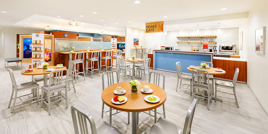 Le Peaks Café offre un lieu de réunion pour ceux qui participent à des activités, comme pour les paroissiens pendant les pauses dans leurs services de Scientology.