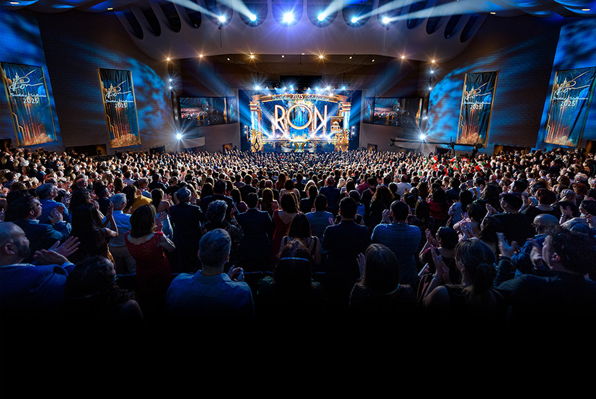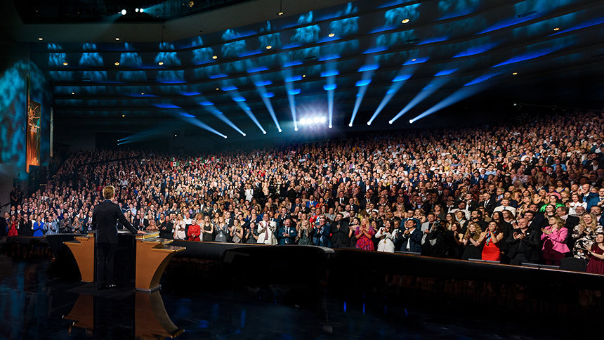 « Il reste encore à aborder un sujet sur le programme de ce soir. C’est l’heure de passer de “l’autre côté du miroir” et de voir ce que l’avenir nous réserve, » a-t-il déclaré. Et pour les milliers de participants, ce qui a suivi était une révélation inattendue, inoubliable et indéniable : un aperçu époustouflant du futur L. Ron Hubbard Hall — un chef-d’œuvre destiné à couronner le complexe de Flag.